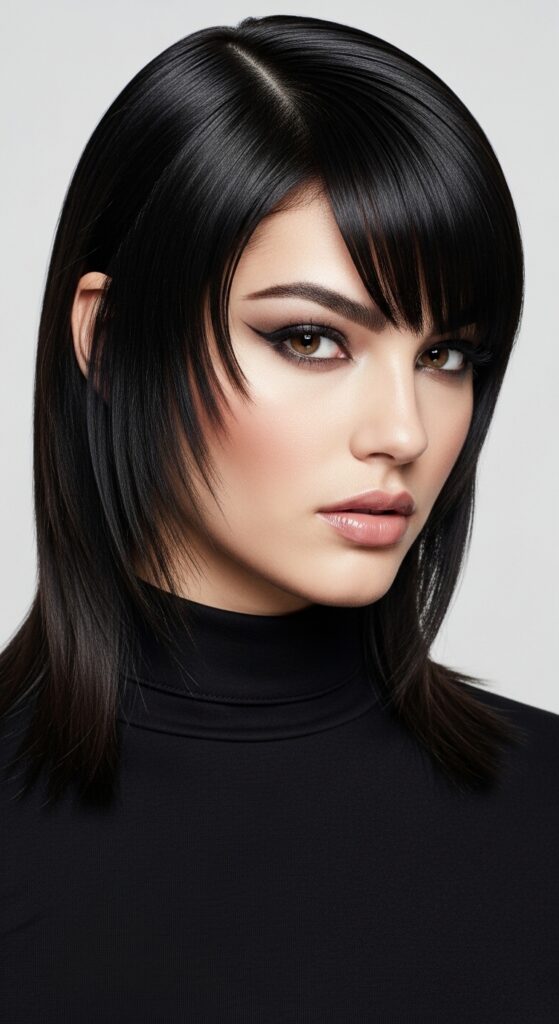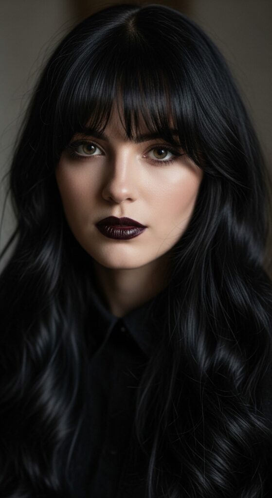 Pair this cut with deep waves or a velvet hair bow for that perfect romantic goth aesthetic. It’s less severe than a blunt fringe, offering a more mysterious, ethereal vibe.