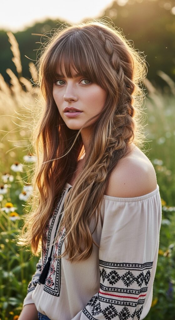 Butterfly bangs are gorgeous when you style your hair up. Try a loose, face-framing braid on one side, letting the bangs and a few pieces fall free.