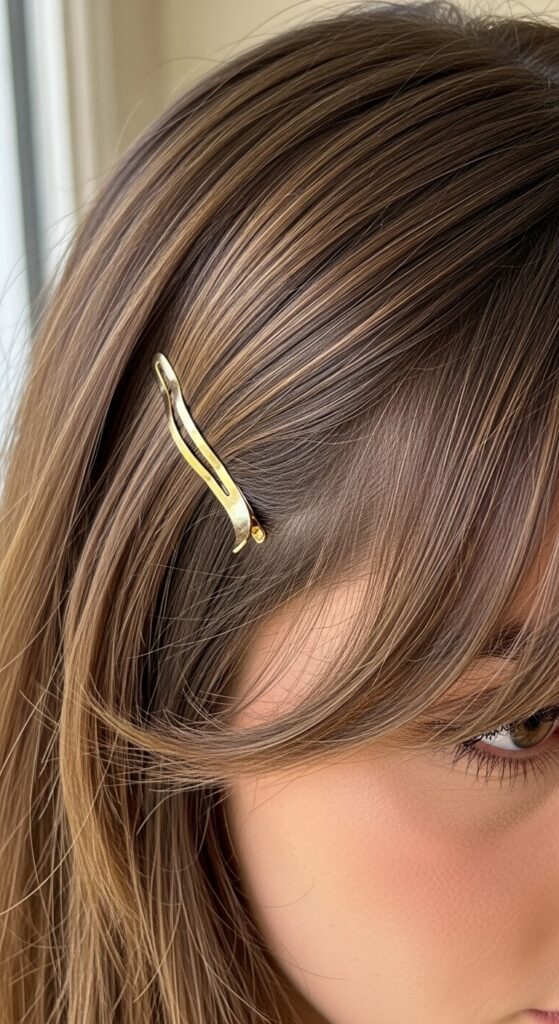 Don’t forget accessories! A small, dainty clip to push your bangs to the side is so pretty. Or, try a thin headband sitting just behind the bangs.
