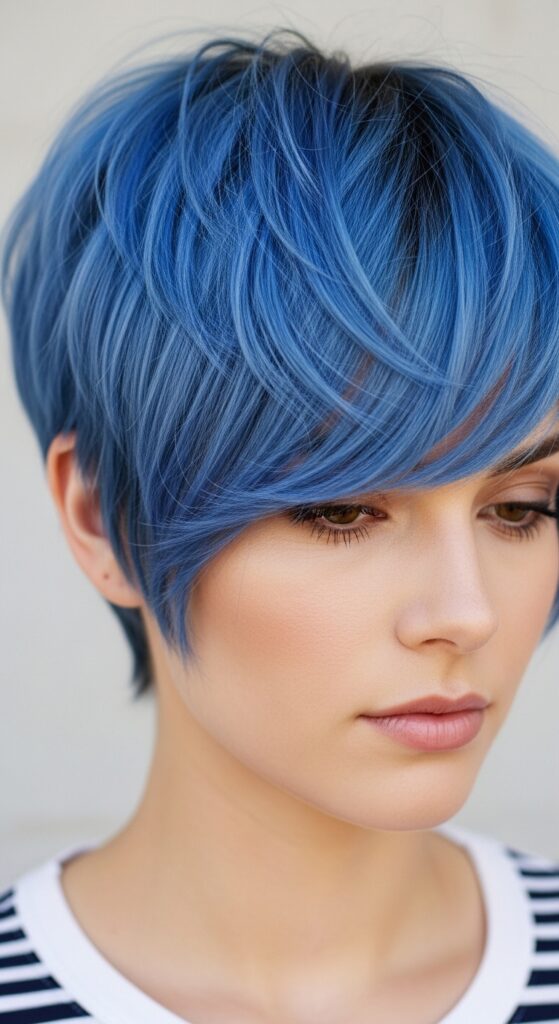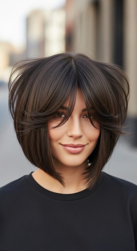 This combination is unexpectedly feminine and cool. The bangs soften the shorter top layers, creating a cohesive flow from front to back.