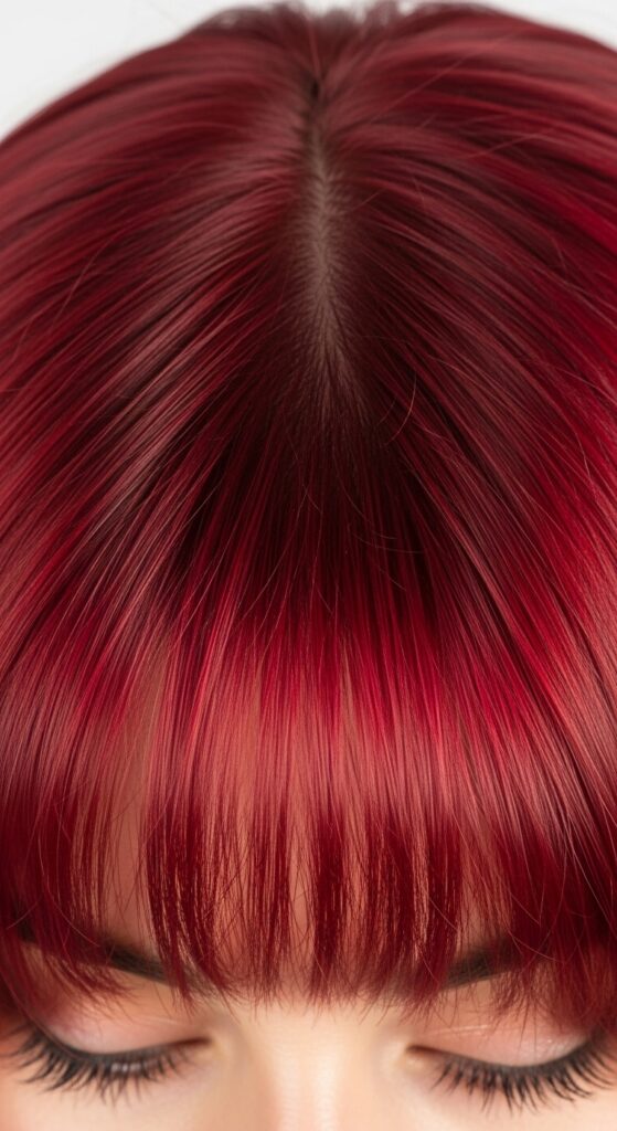 Whether it’s platinum blonde, fiery red, or pastel pink, the bangs add a level of sophistication. It keeps the look from feeling like a solid block of color.