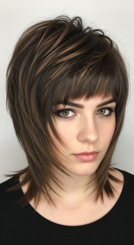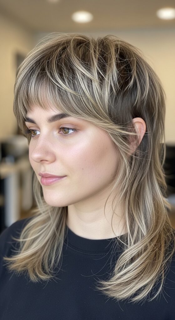If you’re curious about the mullet trend but want a gentler entry point, this is it. The butterfly bangs make it feel fresh and approachable.
