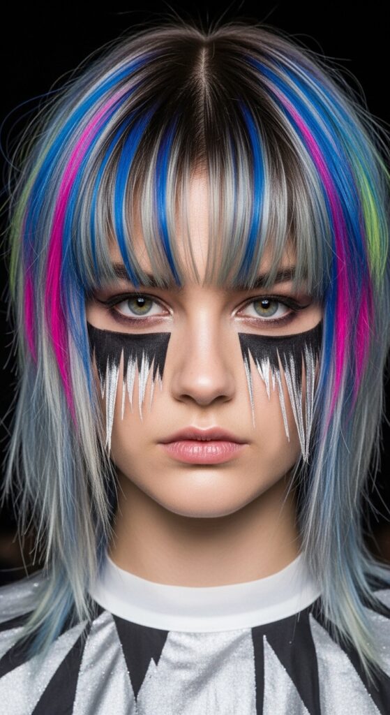 Glitchy glam hair is all about intentional texture and “digital” disruption. Add butterfly bangs, and you get a masterclass in cool. Think piece-y, uneven layers and maybe some strategic highlights.