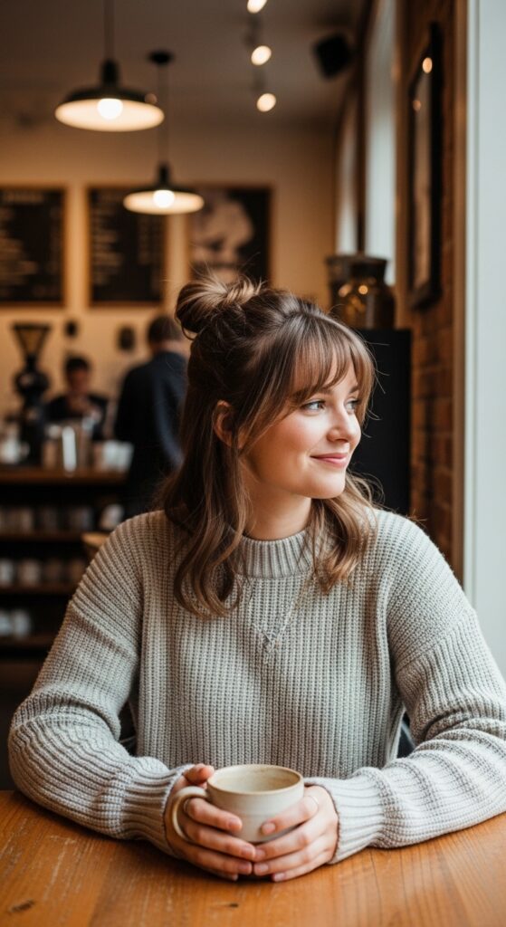 This is the perfect way to style your hair and still show off your bangs. Pull the top section back into a bun or clip, leaving your curtain bangs and some pieces free.