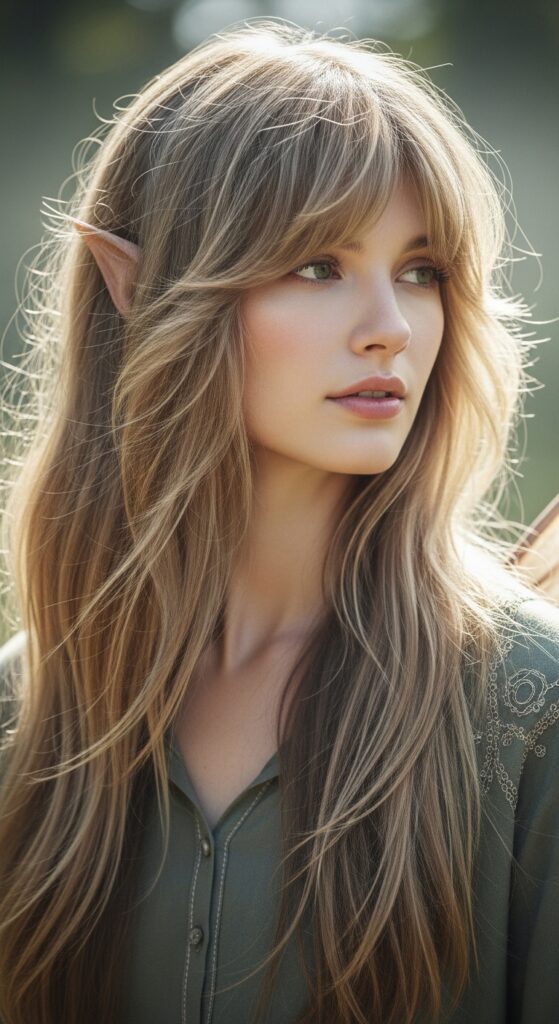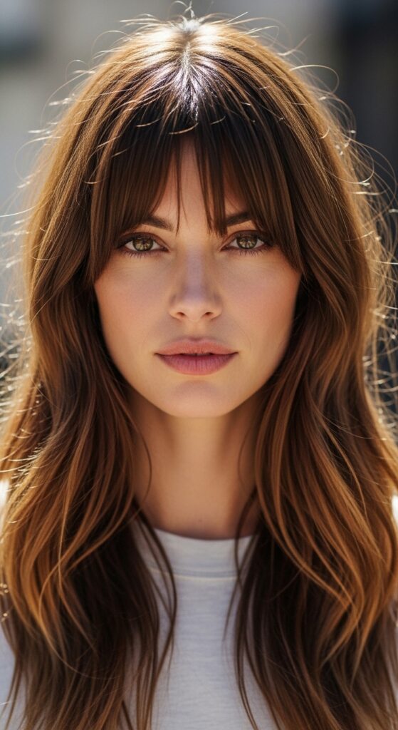 If you have very long hair, this is magical. The curtain bangs are cut long and wispy, sometimes reaching past the chin. They blend into long, soft layers.