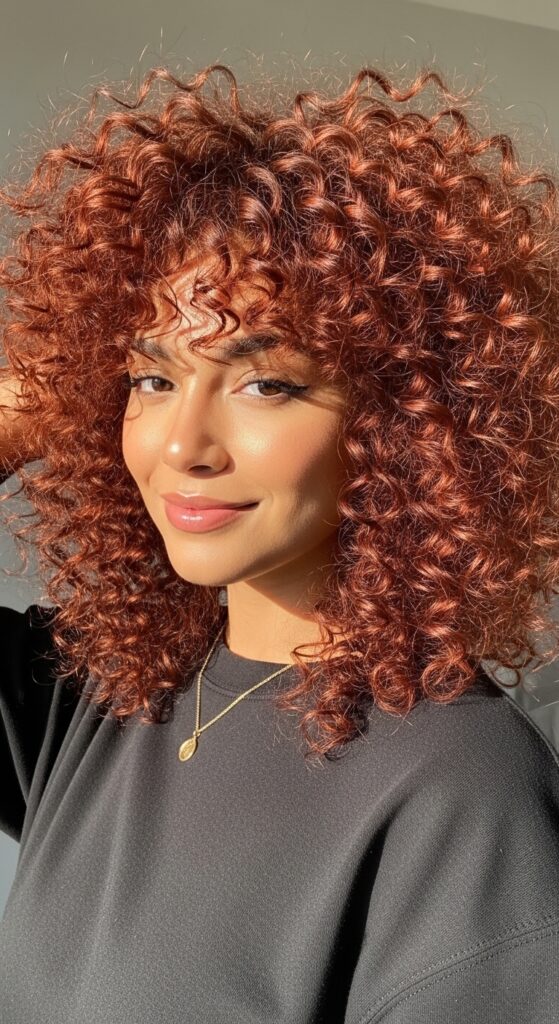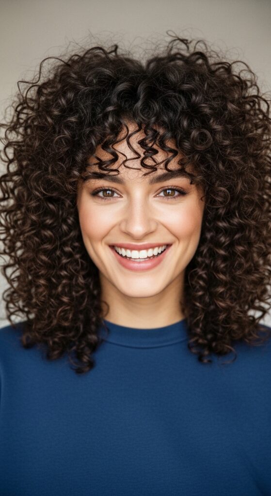 Curly girls, embrace your pattern! Curtain bangs can be cut to work with your natural curl. They’ll spring up shorter when dry, so your stylist should account for that.