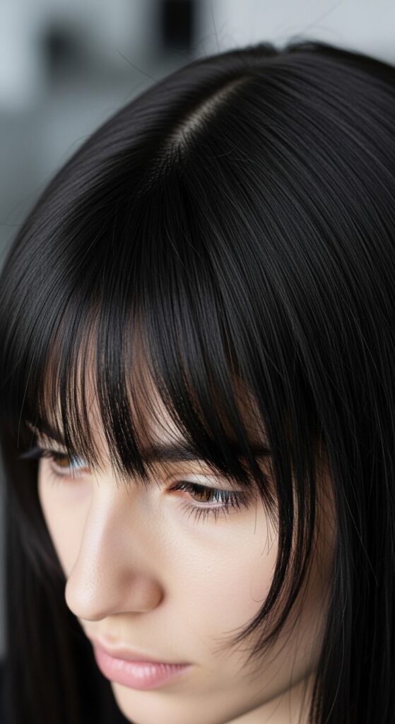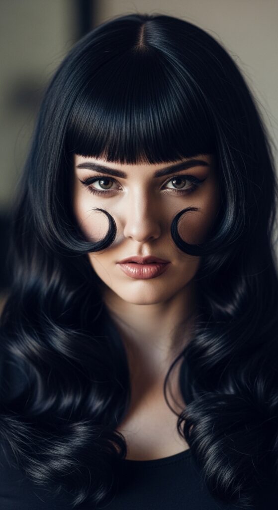 This is where soft meets dramatic. The curtain bangs add a frame to a darker, more romantic aesthetic. It’s less scary, more poetic.