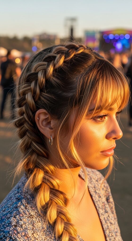 Don’t hide your bangs on a bad hair day—feature them! Incorporate your curtain bangs into a beautiful braid that starts at your part.