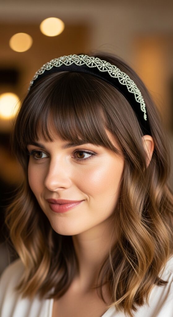 Headbands, clips, and bandanas are a curtain bang’s best friend. Place a headband just behind the bangs to keep them in place and add a cute accessory.