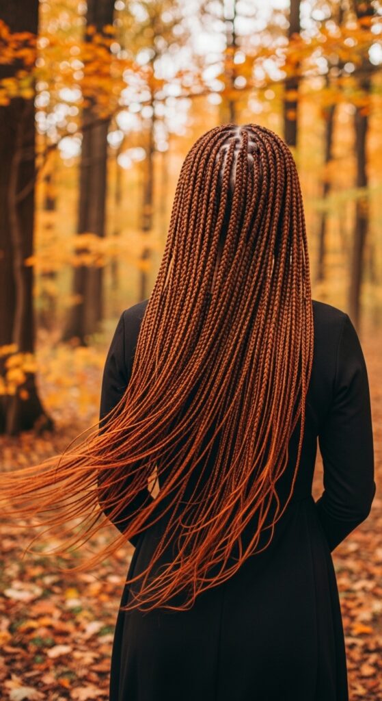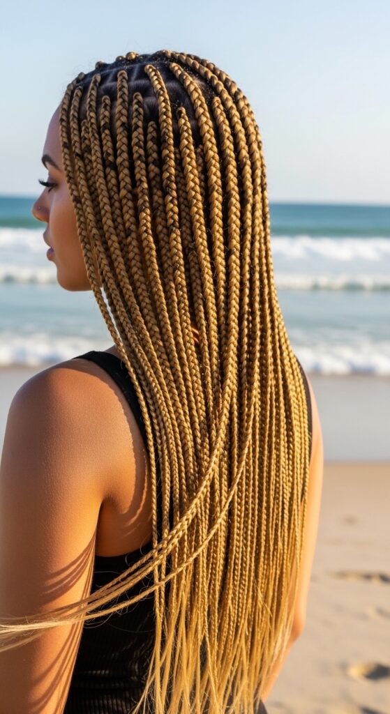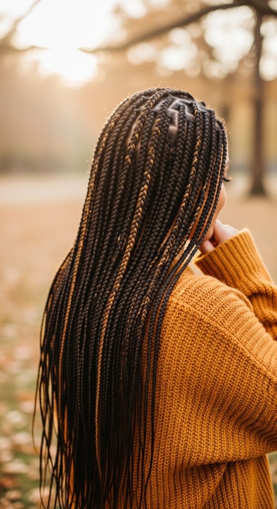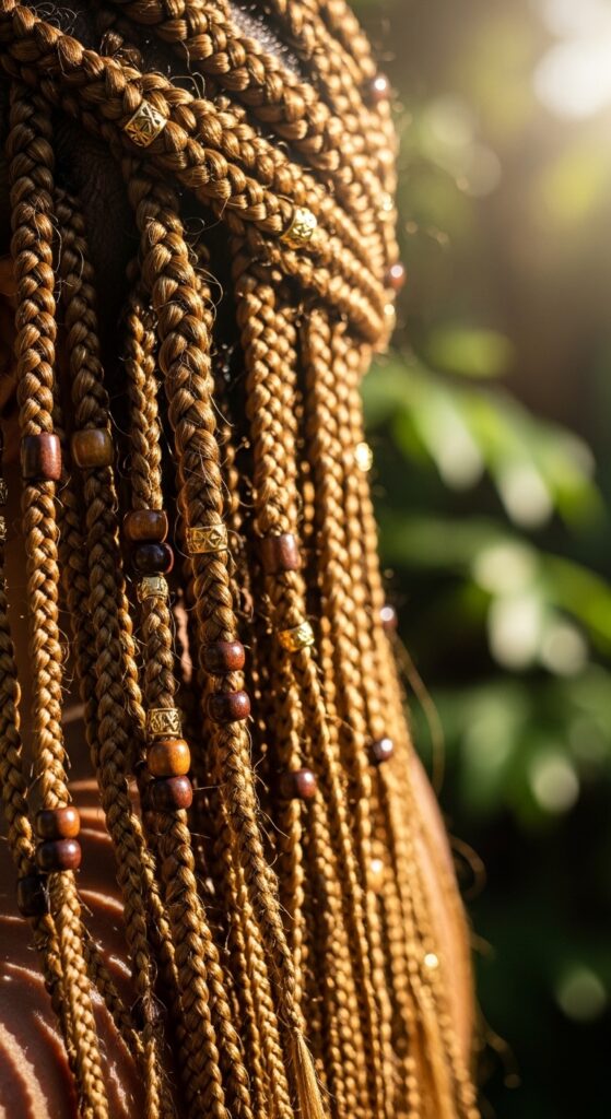 Accessorize! Adding a few strategic beads to your braids can elevate the entire look. Golden brown braids with wood or gold beads feel earthy, bohemian, and intentional.