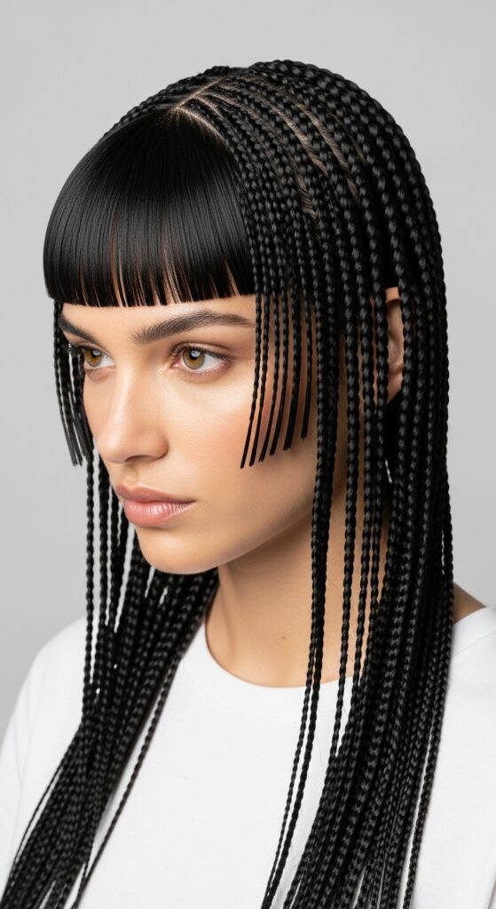 Channel some anime-inspired elegance. The “hime cut” features blunt, straight-across bangs and long, straight sides. Translated into braids, it creates a striking, graphic look.