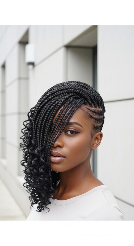 Love the “asymmetrical lob” trend? You can get it with braids! This cut is longer on one side, creating an interesting, fashion-forward silhouette that’s far from basic.