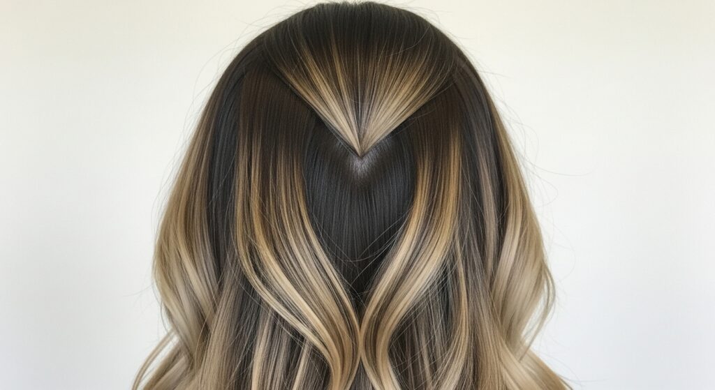 13. The Cascading Effect: Light pieces are painted in diagonal, cascading sections from the part down to the ends, following the hair’s natural fall.
