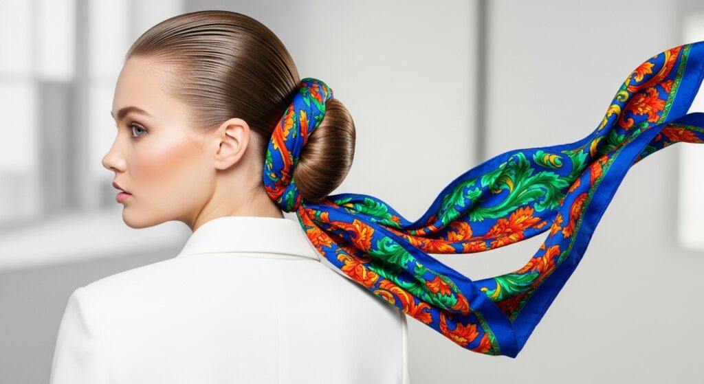 Elevate the classic slicked-back bun by incorporating a long, thin scarf. After slicking hair back, incorporate the scarf into your low bun or wrap it around the base. The long, trailing ends of the scarf add a dramatic vertical element that literally draws the eye down the length of your back, amplifying the elongating effect. It’s a chic, runway-inspired look that’s surprisingly easy to achieve.