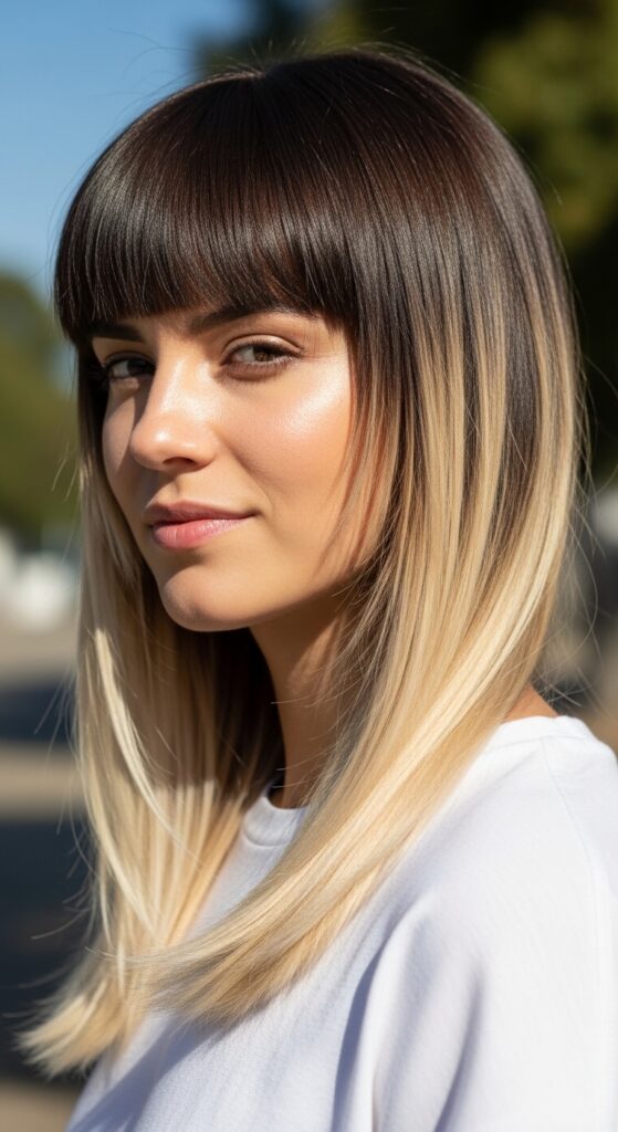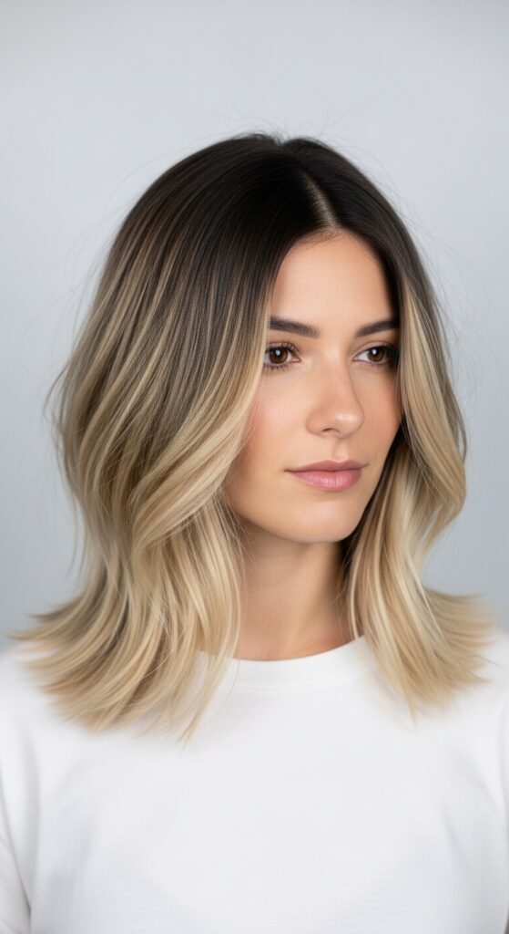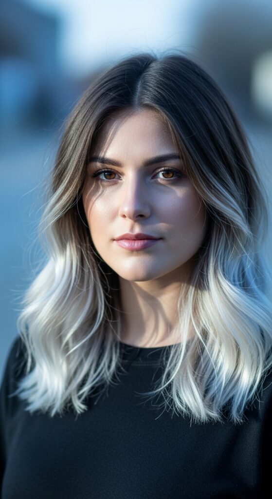 Cool tones, assemble. If warm colors aren’t your thing, this is a very cool and confident choice. The top is a muted ash brown, and the ends go into a clean, icy blonde. The transition is so smooth it looks like a filter. This look is very popular in 2026 hairstyles because it feels so fresh and clean. It’s especially striking with an asymmetrical lob or a sharp bob. The key is that the ash brown and icy blonde share the same undertone, so they blend seamlessly. Use a blue or purple shampoo to keep the ice from getting brassy.