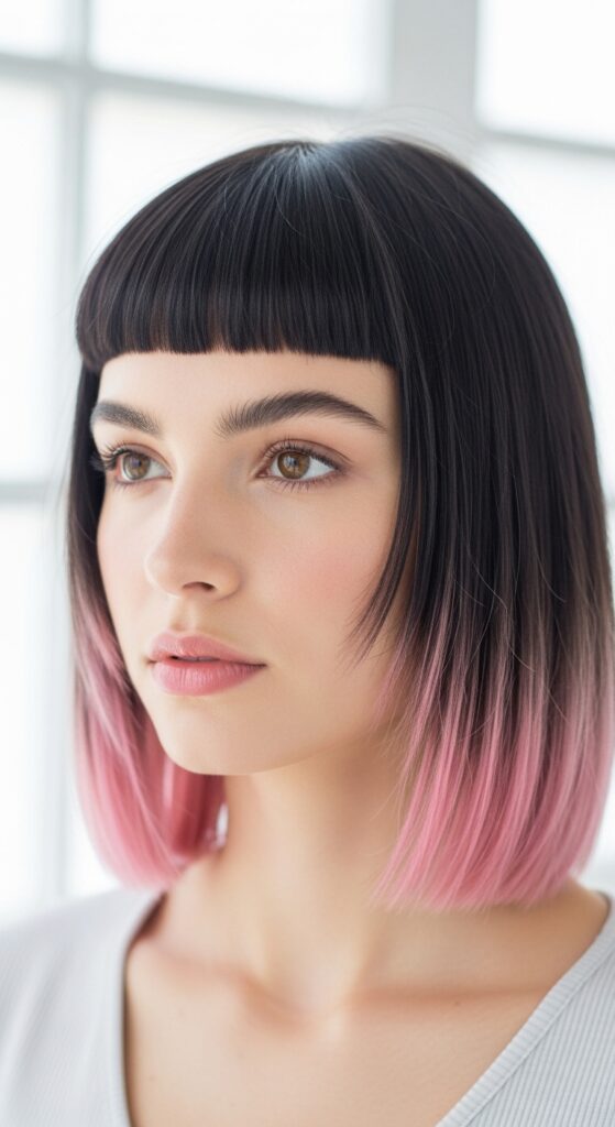 If you love Japanese street style and a bit of anime flair, the hime cut with an ombre is your new look. The hime cut is the one with the blunt bangs and sleek side pieces. It’s very structured. Now, imagine that structure with a dark base and the ends fading into a pastel pink, lavender, or mint. The contrast is absolutely stunning. It’s a perfect way to dip your toes into fantasy colors without committing to your whole head. The ombre starts around the shoulders, so the ends get all the fun. This is a statement, but it’s a very wearable one.