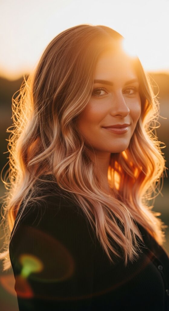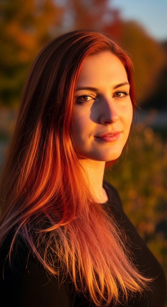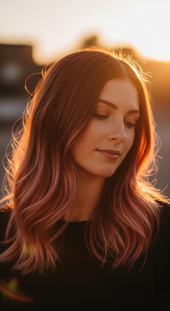 Auburn and rose gold are sisters in the color wheel, so this ombre is incredibly harmonious. The top is a rich, warm auburn, and the ends turn into a soft, delicate rose gold. It’s romantic, warm, and very flattering. This is a brilliant choice for fall and winter because it adds warmth without being too orange. The rose gold ends give it a modern twist. This color looks amazing with a middle part and soft waves. It’s a very “rich aunt” energy—the one who always has the best wardrobe.