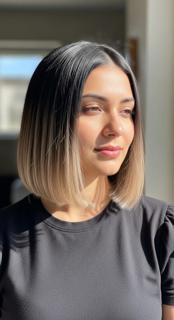 The asymmetrical lob is a haircut that means business. It’s sharp on one side, soft on the other. Adding an ombre dip to the ends makes it even more striking. Keep the roots your natural dark shade and let a sandy or beige blonde take over the ends. The asymmetrical shape draws the eye down, and the color change emphasizes the movement. This is a serious upgrade for women who want a modern, editorial look that still works for a 9-to-5. The short side can hit right at the jawline, which is super flattering. Styling is simple—a quick blow-dry with a round brush and you’re out the door.