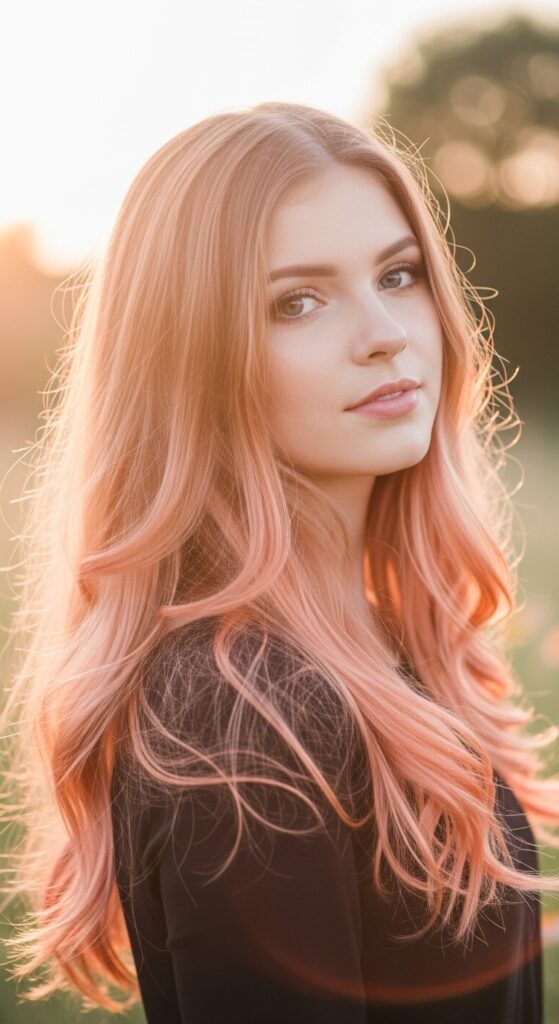 This is for the sweethearts. It starts with a delicate strawberry blonde at the roots and fades into a peachy, almost coral tone. It’s very romantic and girly without being childish. It fits into the romantic goth hairstyles category if you pair it with dark clothing, but it’s also perfect for a picnic date. The peach ends catch the light beautifully. Because it’s a pastel-ish color, use a color-safe shampoo and avoid too much heat styling. Air-drying with a lightweight mousse gives it a lovely, soft texture.