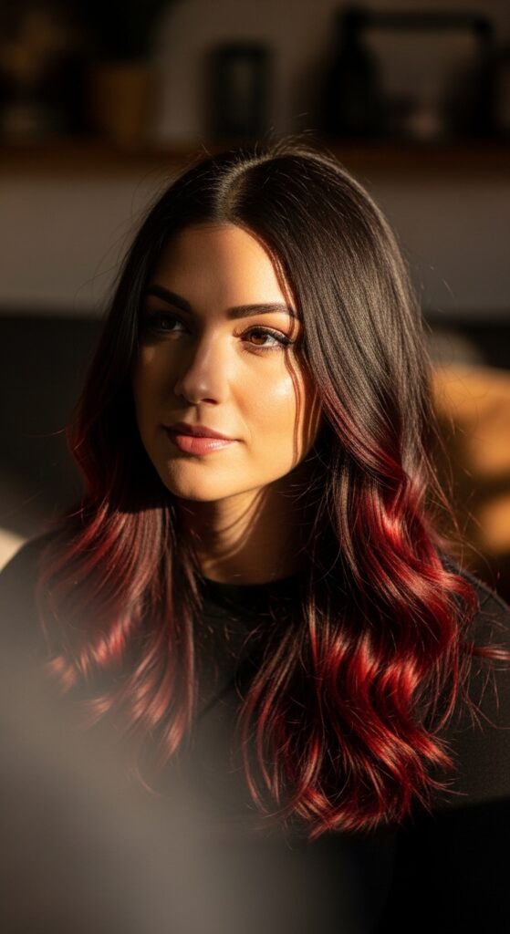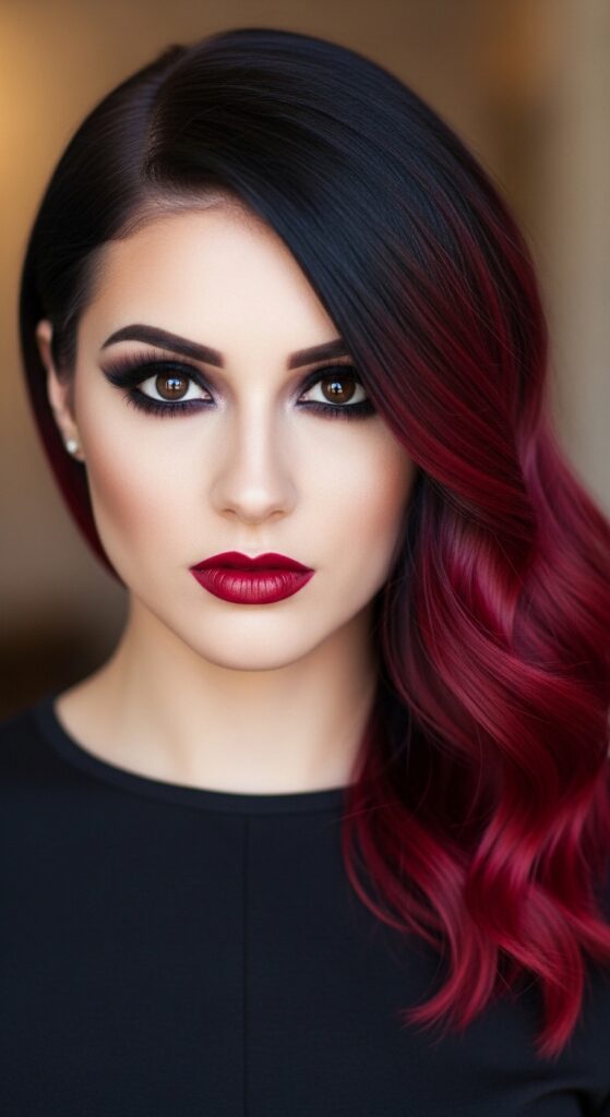 The vampire haircut is all about sharp edges and dramatic angles. It’s like a modern bob with serious bite. Pair it with a two-tone ombre—black at the roots and a very deep or bright crimson red at the ends—and you have a look that’s straight out of a gothic romance novel. The contrast is intentional and sharp. This is not a subtle ombre. The color change should happen around the chin or shoulders. It’s statement hair for women who love fashion. The red will pop against the black, especially when you move.