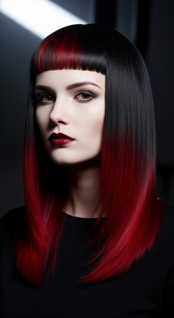 Okay, this one is for the dark romantics. Think vampire haircut meets modern color. The top is a deep, almost blue-black, and the ends gradually shift into a rich, dark cherry or burgundy. It’s moody, mysterious, and incredibly chic. This fits perfectly into the romantic goth hairstyles aesthetic. It gives off major “I just inherited a castle” energy. The contrast is bold but not cartoonish because the red is so deep. It works best with long hair or a blunt bob. To keep the red from fading into a weird orange, wash your hair in cool water and use a color-depositing conditioner once a week.