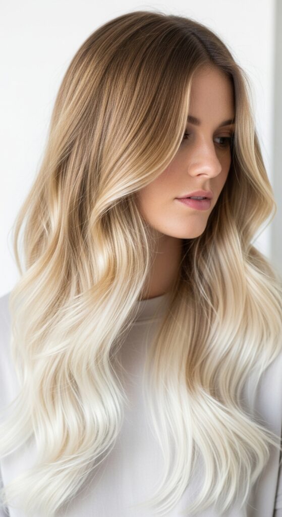 This is a high-impact, super glamorous ombre. You start with a warm golden blonde, and it slowly builds up to a nearly white platinum. It gives a very expensive, sun-kissed effect. This is a favorite for bridal looks or special events. It photographs beautifully. The golden roots keep it from looking too harsh, and the white ends add a touch of drama. Because of the high level of lightness, use a deep conditioner weekly and a bond repair treatment. This is definitely a color that says, “I take my hair seriously.”