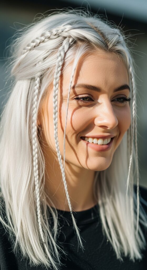 Adding tiny braids to platinum hair is such a fun way to mix things up without a full commit. It gives your hair a little texture and a playful edge while keeping that icy color front and center.