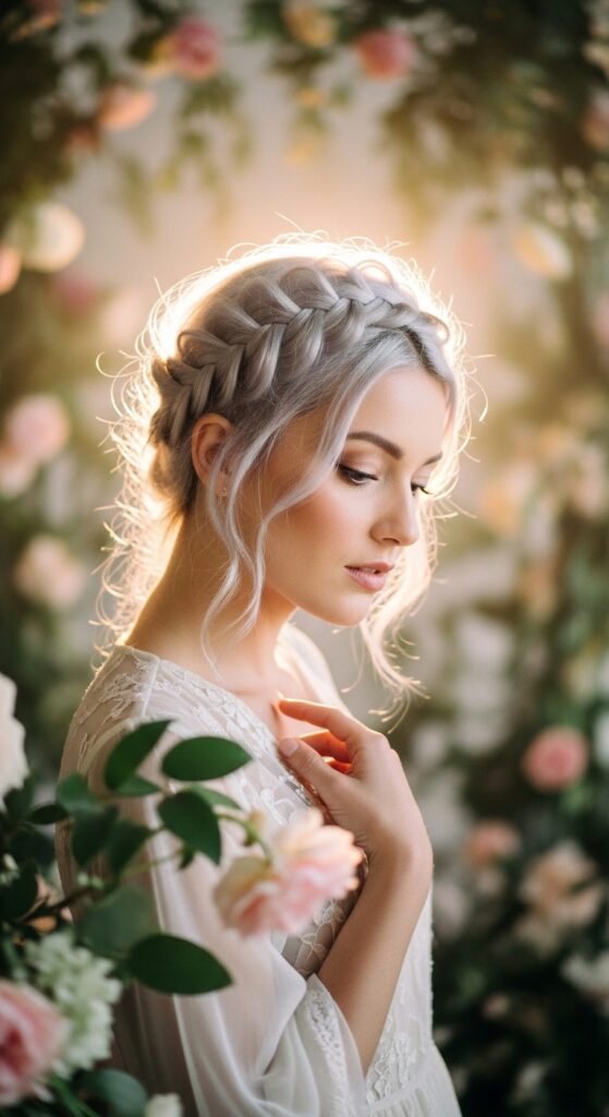 A braided crown with platinum hair is straight out of a fairy tale. The light color makes the braid patterns really visible. It’s a beautiful updo option for weddings, festivals, or just a day when you want to feel special.