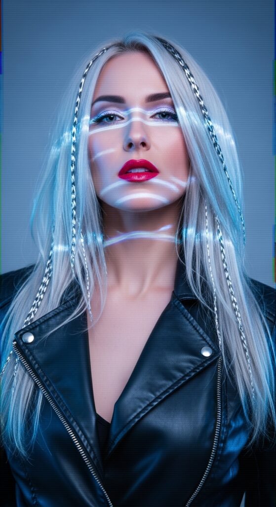 Now here’s something for the trendsetters. Glitchy glam hair plays with metallic silver accents that catch the light in a slightly uneven way. It mimics a digital glitch, but in a very polished, deliberate way.