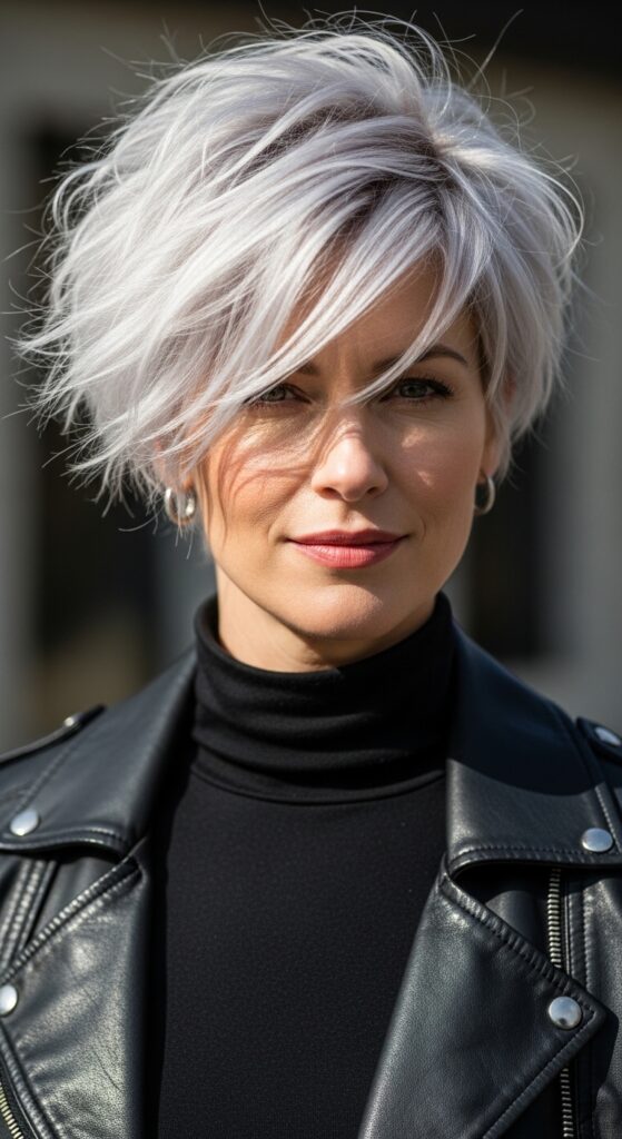 Use a bit of texturizing paste or sea salt spray to give it that airy volume. The platinum color makes the layers really stand out. It’s bold, practical, and honestly, it saves you so much time in the morning.