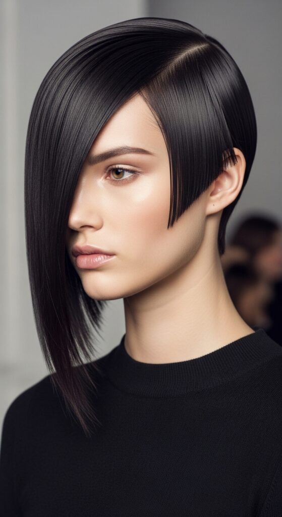 This is a commitment to a bold shape. The front pieces are the star, often cut between chin and collarbone length. It looks incredible with blunt bangs or a curtain bang variation. Keep it sleek and straight to really emphasize those clean, sharp lines.