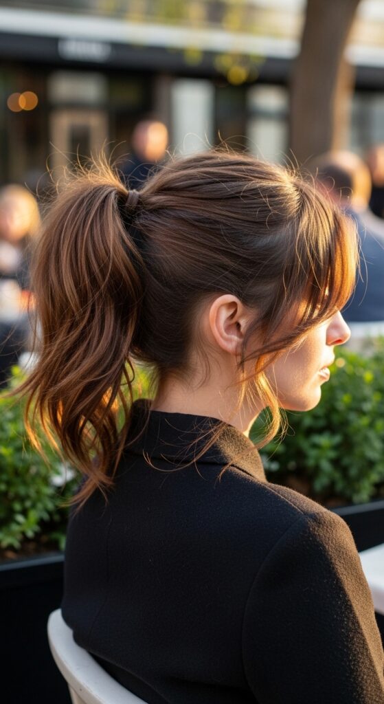 To nail it, backcomb gently at the crown for lift before securing. Leave out a few face-framing pieces and pull the ponytail itself slightly looser. Finish by wrapping a small section of hair around the elastic to hide it for that salon finish.