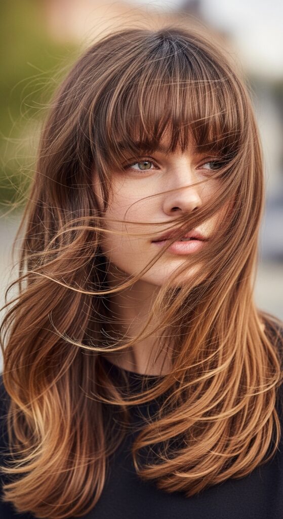 These bangs are so easy to style. Just blow-dry them away from your face with a round brush, and they’ll naturally fall into that perfect shape. They blend seamlessly into long layers, creating movement and a beautiful, light feel.