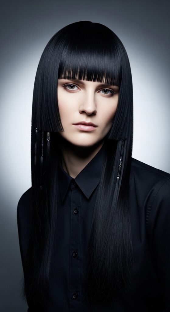 The hime cut, inspired by traditional Japanese princess styling, is having a major fashion moment. It’s characterized by straight, blunt-cut front strands (like long bangs) paired with shorter, layered hair at the back. It’s dramatic, geometric, and utterly striking.