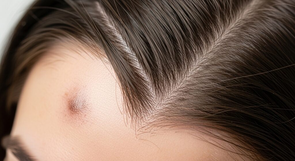 4. Deep Side Part: One of the simplest yet most effective tricks. A deep side part shifts the volume and focus of your hair to one side, naturally shadowing or drawing attention away from the opposite side of the forehead.