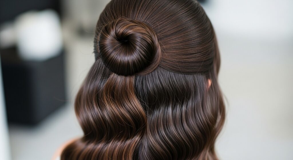 Start with soft, velvety curls. Take a deep section from your temples back, twist gently, and pin into a low, horizontal French twist at the back of your crown. Let the curls flow freely. This is pure 1950s Hollywood starlet appeal.