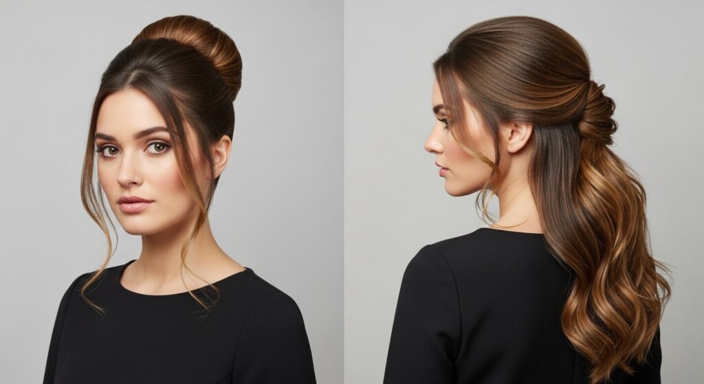 For a professional setting, use a smoothing serum and brush your hair into a high-gloss finish. Create a tight, neat half-up twist at the back of your head. This look is powerful, polished, and perfectly put-together.