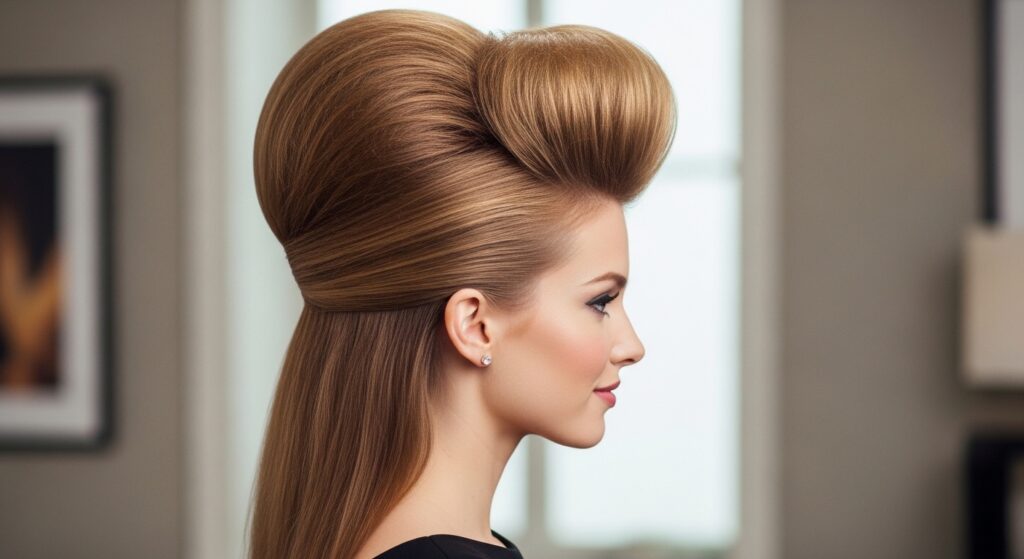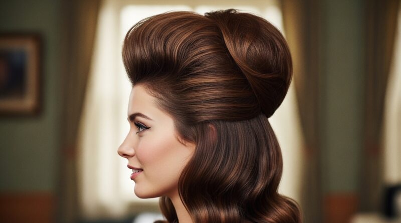 Backcomb the crown area thoroughly before gathering your half-up section. Create the twist high on the back of your head. This 1960s-inspired look is all about dramatic height and glamour.