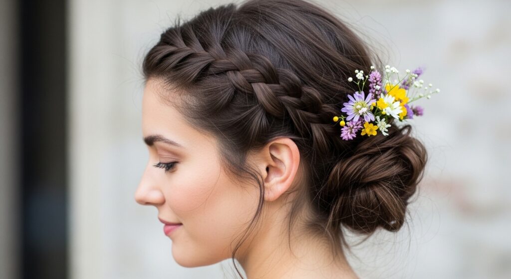 Create a half-up French twist that wraps around the entire back of your head like a halo, starting from one temple and ending at the other. Leave the hair below the twist down. It’s an ethereal and romantic look.