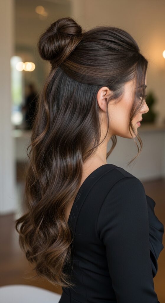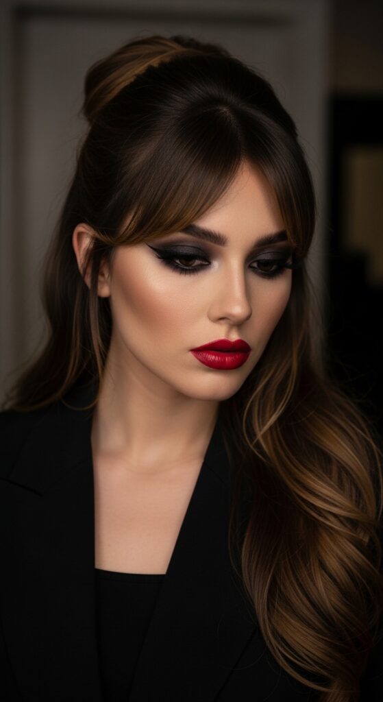 This style never goes out of fashion. It’s romantic, keeps hair off your face, and looks incredible with loose waves. Start by creating a deep side part for softness.