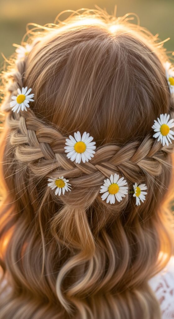 After creating your half-up braid or twist, use bobby pins to secure small sprigs of baby’s breath or a few small flowers near the base of the style.
