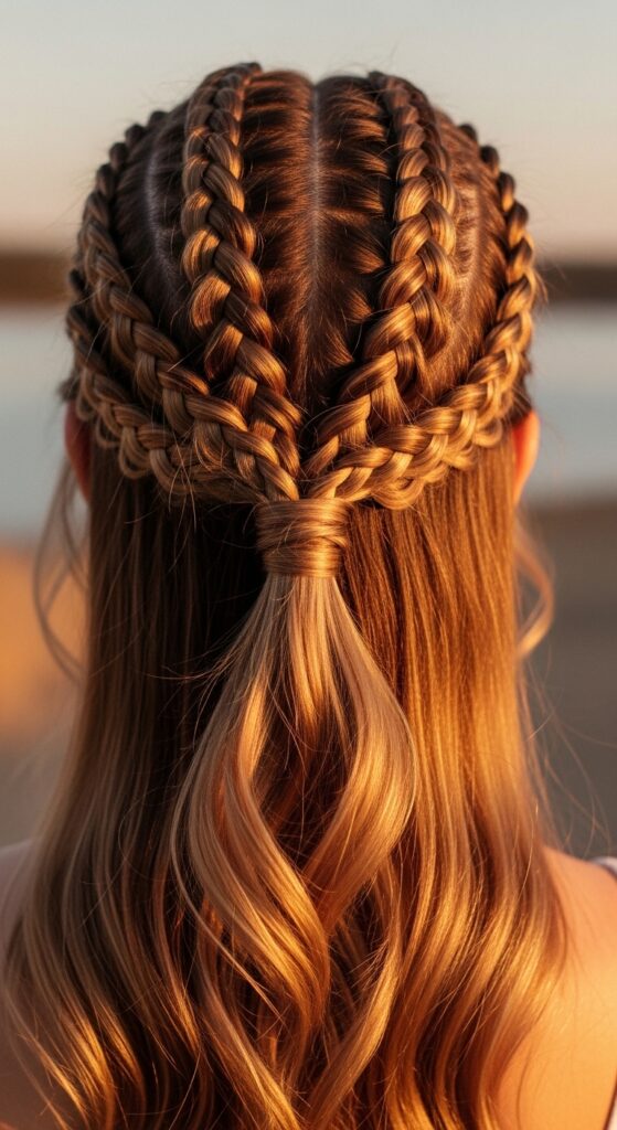 Start two Dutch braids at the front hairline, braiding them back until you reach the crown. Then, combine them and secure them, letting the ends blend with your waves.