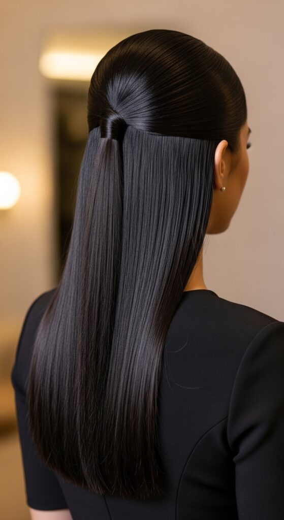 Sometimes, sleek and shiny is the ultimate power move. This style is modern, clean, and lets your dress and makeup take center stage.