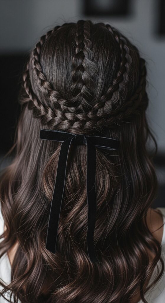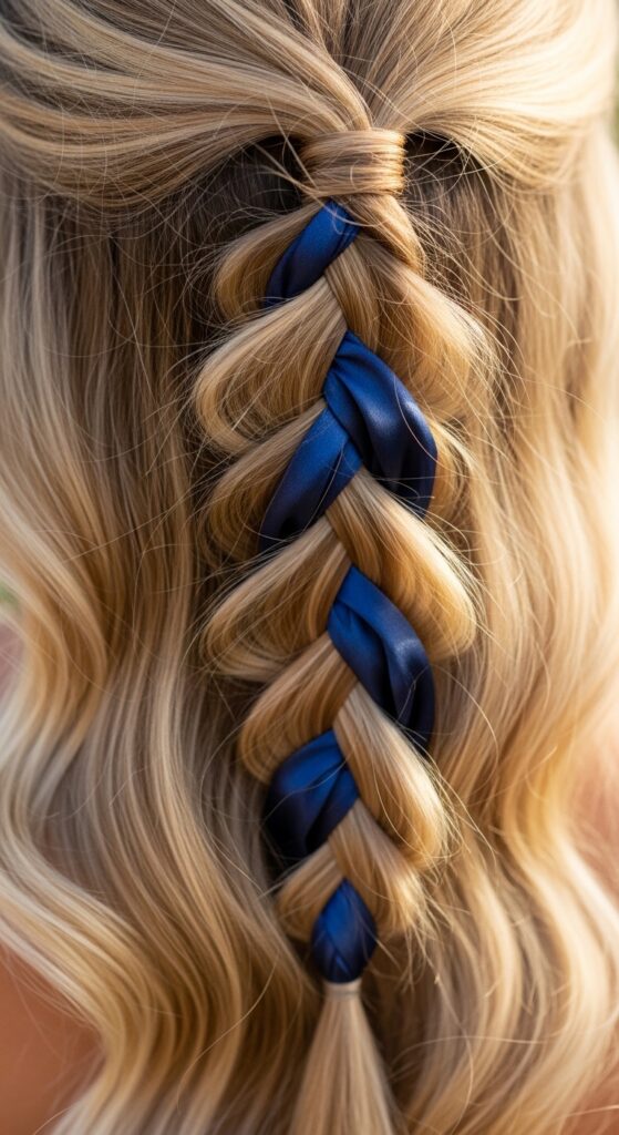 Ribbons are a huge trend. Weaving one into your half-up braid adds a pop of color and a touch of sweet, romantic detail.