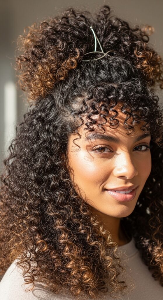 Use a wide-tooth comb to gather the top section. Twist it gently back and secure it with a strong clip or elastic. Don’t fight the curl pattern—enhance it.