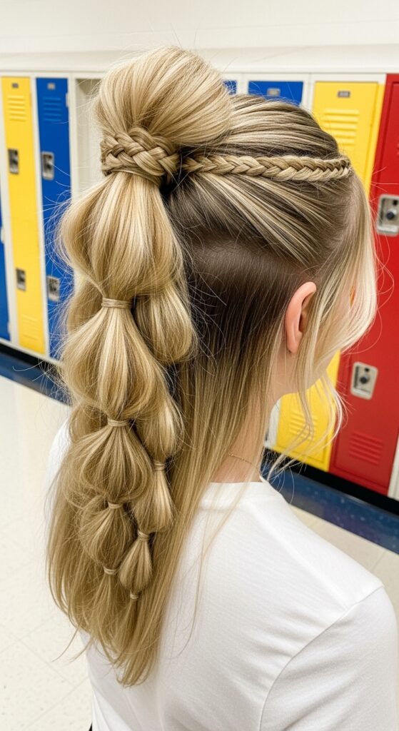 So fun and youthful! The bubble ponytail is back and it’s perfect for homecoming. Adding a small braid into the mix takes it to the next level.