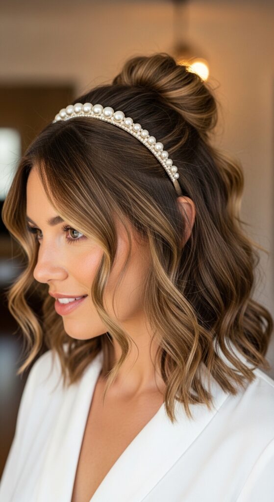 Place a fabric or pearl-encrusted headband over your hair. Then, gently pull a few sections from the front to tuck loosely behind the headband, creating a half-up effect.