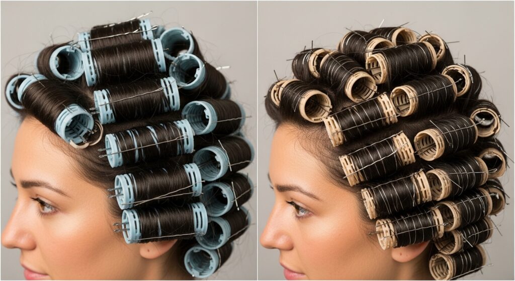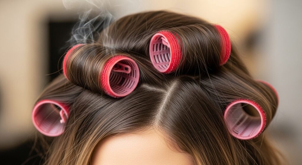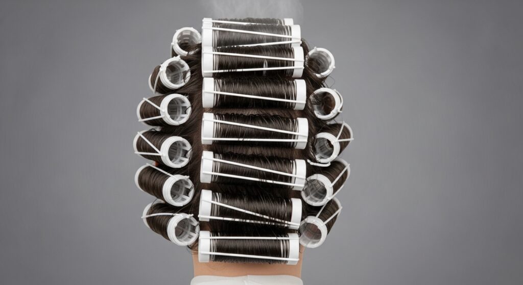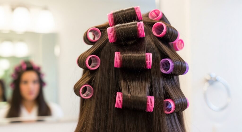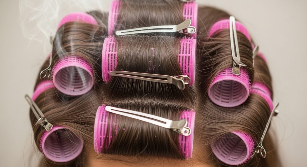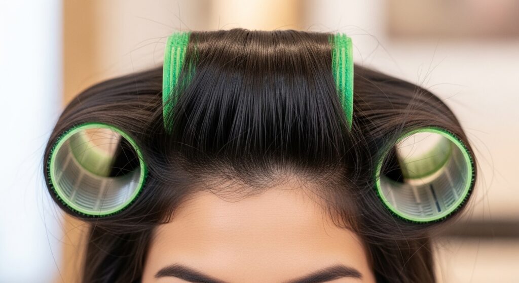 Placement: Use only large or jumbo rollers. Section hair cleanly. Roll all rollers in the same direction—either all back or all downwards. The key is to roll the hair only once or twice around the roller, so the ends barely catch. This technique adds a slight bend and tremendous root volume without creating tight curls. Let cool completely.