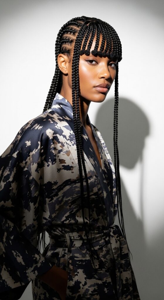 Inspired by the iconic Japanese hime cut, this look features straight-across fringe braids paired with the rest of your hair in long, straight knotless braids. It’s a bold, graphic look that frames the face beautifully.