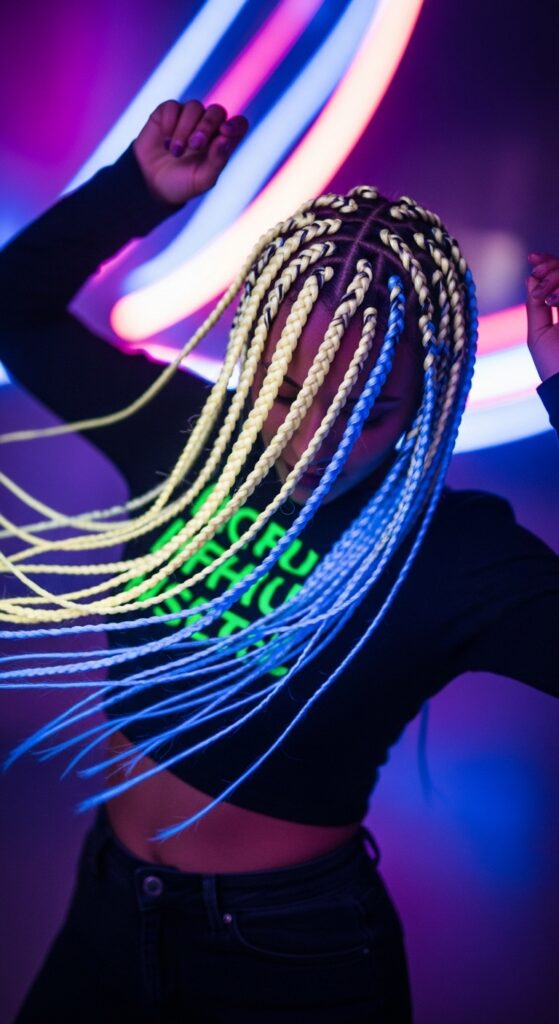 Embrace the digital-age beauty trend with glitchy glam hair effects. Ask your braider to weave in unexpected pops of color—like electric blue, neon pink, or silver—in strategic, disconnected sections throughout your braids.